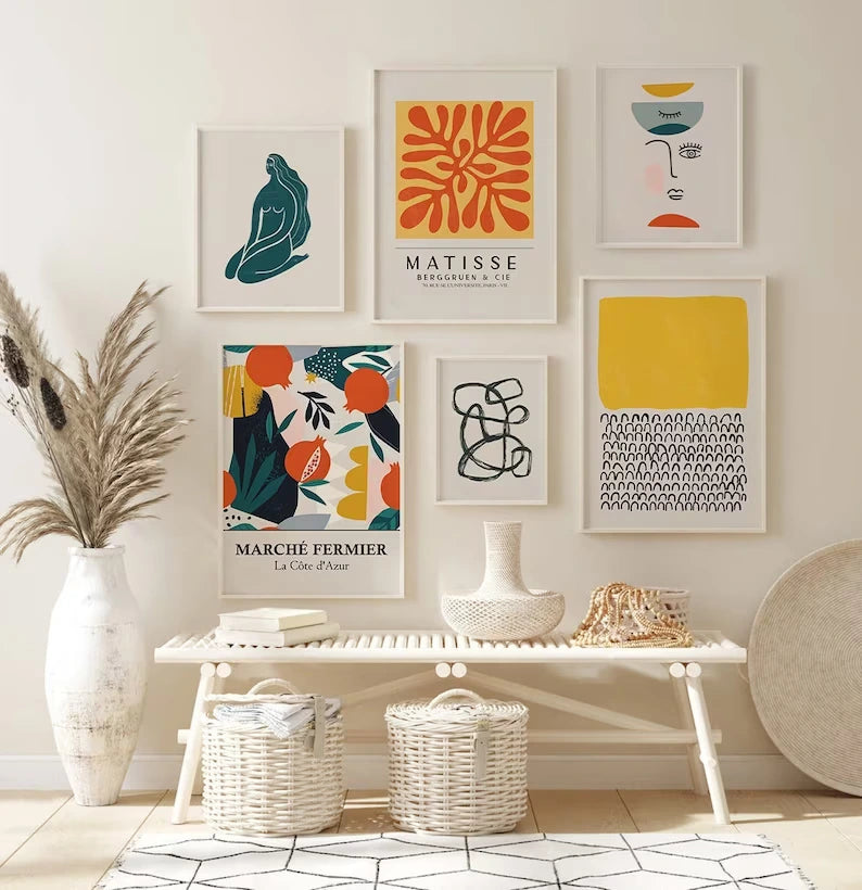 Abstract shapes, the classics Cut-outs by Matisse, Ocher yellows, Oranges and Greens, are the master of this collection of prints inspired in Mediterranean countries. Create for compose this balanced and happy gallery of posters.